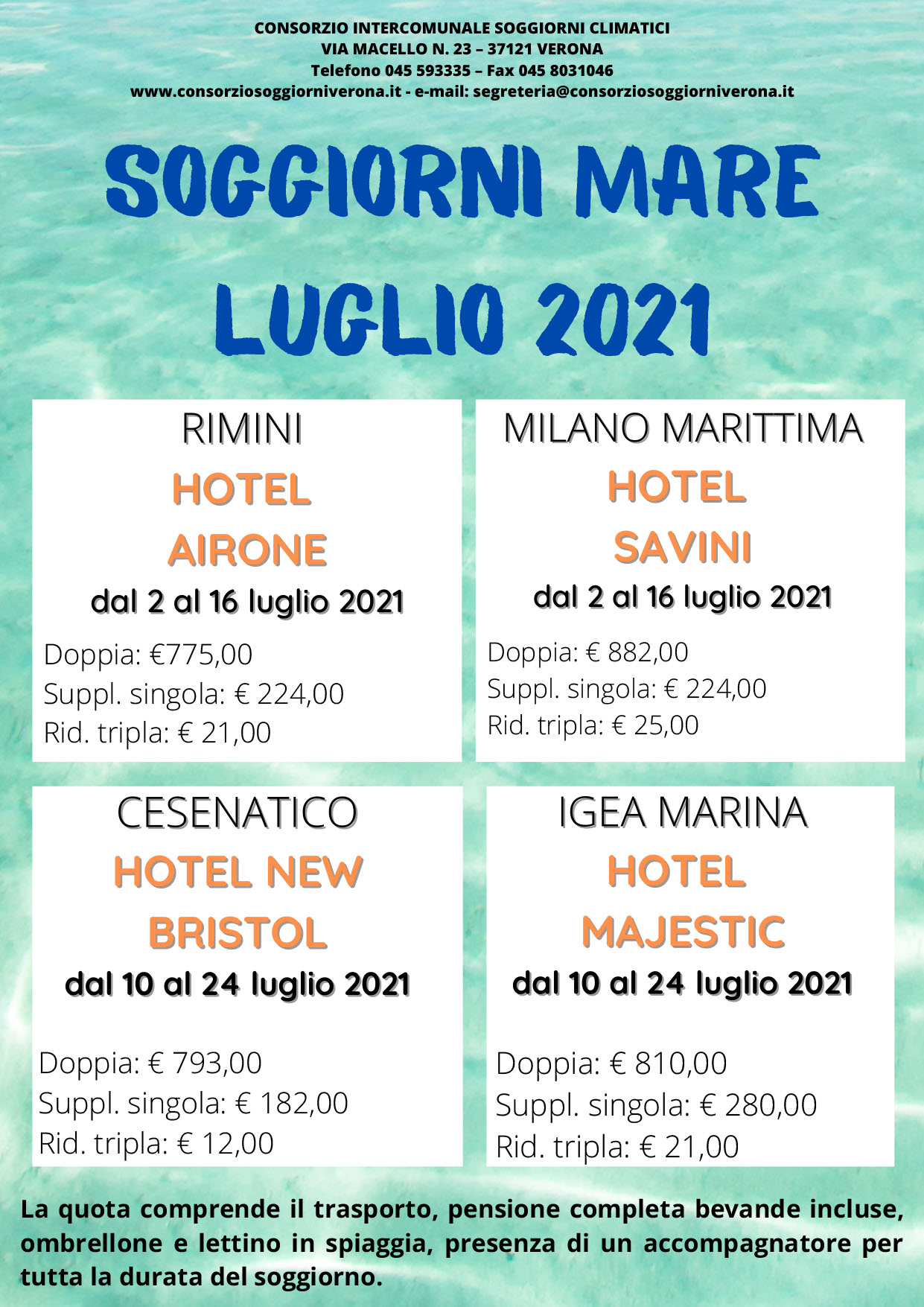 Il ConsorzioIl Consorzio Intercomunale Soggiorni Climatici di Verona è un ente locale, dotato di propria autonomia e personalità giuridica. Coordina le attività di turismo sociale di 32 Comuni consorziati della Provincia di Verona. Lo statuto consortile precisa che le finalità dell'ente sono quelle di agire quale organismo di gestione e coordinamento delle iniziative, dei programmi e dei servizi rivolti soprattutto ad anziani, minori e disabili per l'effettuazione di soggiorni climatici. |